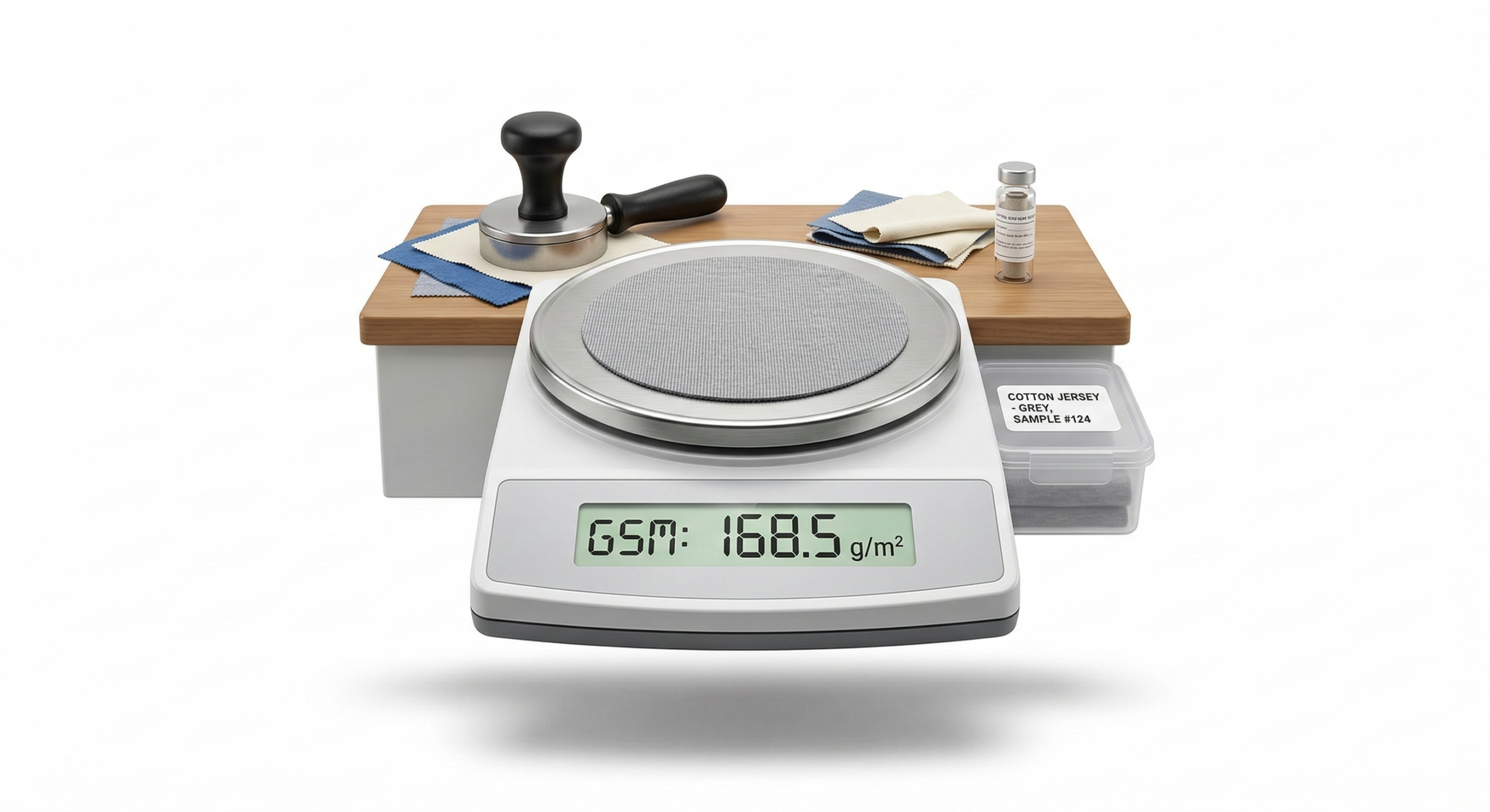 Gunakan timbangan digital dengan akurasi 0,01 g. Potong kain berukuran 10 cm × 10 cm (100 cm²), timbang, kemudian kalikan hasilnya dengan 10.000 untuk mendapatkan nilai GSM. Jika hasilnya berada dalam rentang ±5% dari nilai label, kain dapat dianggap sesuai.