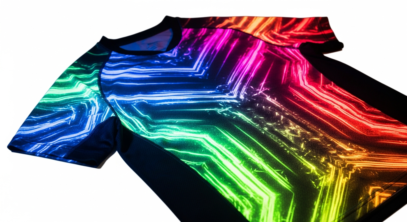 - Penggunaan kain polyester drifit 150 GSM dengan lapisan phosphorescent yang menyala di bawah UV, memberikan kontras jelas antara area gelap dan neon; suhu sublimasi optimal 210 °C untuk mengunci pigment.