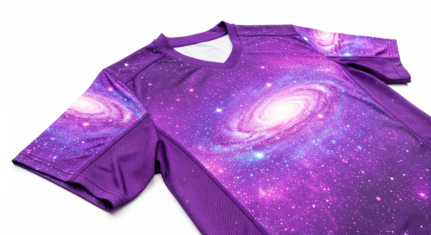 Namun demikian, Secara teknis, ungu galaxy mengacu pada kode warna Pantone 2765 C yang dipadukan dengan metallic silver foil pada lapisan akhir. Di dalam produksi jersey, kami menambahkan lapisan polyurethane transparan berukuran 0,03 mm untuk melindungi pigment dari fading, sehingga warna tetap tajam setelah 30 siklus pencucian.