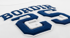 3. Gradient stitch density – Pada logo tim, area besar menggunakan kepadatan 2,5 mm, sedangkan detail nomor punggung menggunakan 1,8 mm. Hasilnya, detail nomor lebih tajam tanpa menambah ketebalan kain.