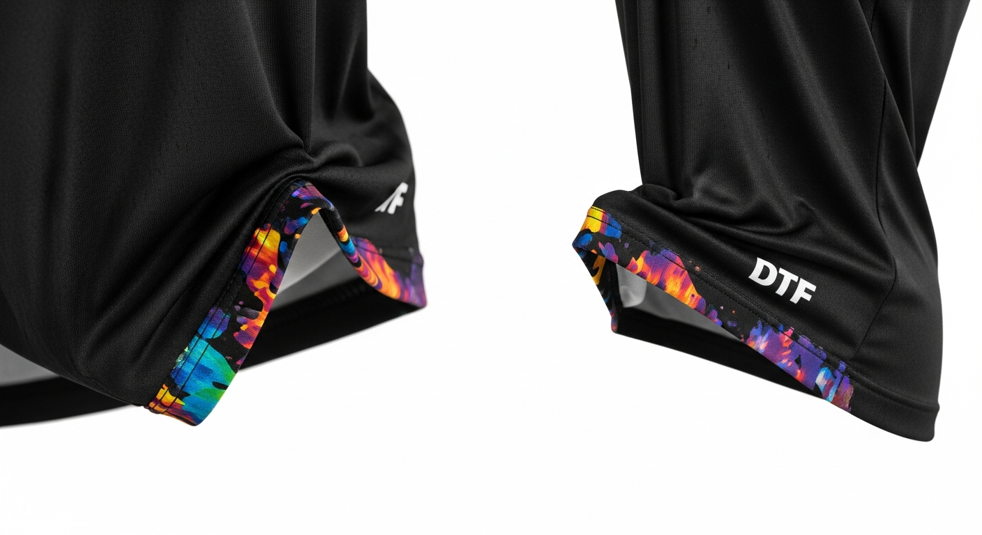 1. Warna Penuh pada Kain Gelap – DTF mengatasi batasan warna pada jersey hitam, menghasilkan gradasi halus dan efek neon.